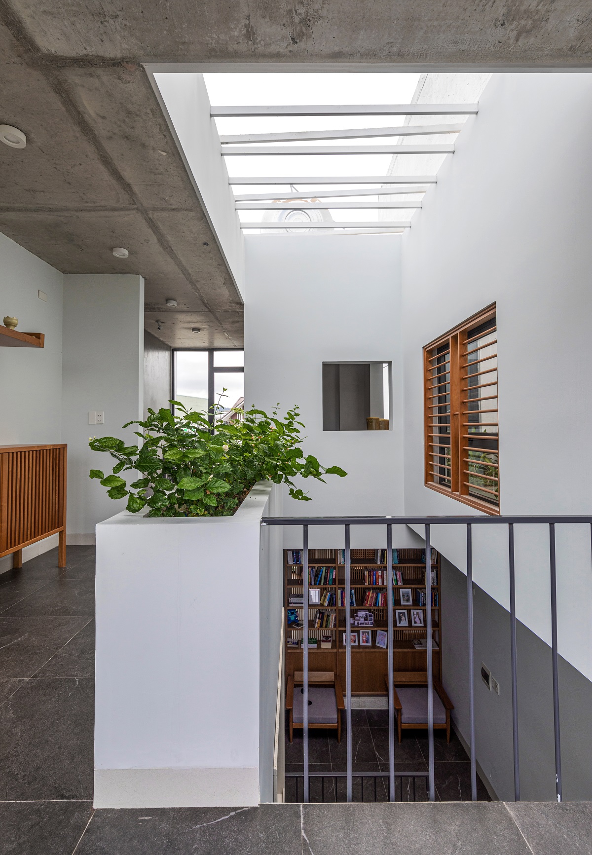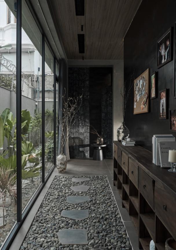 Để duy trì tinh thần tối giản nhưng không đơn điệu, nhóm thiết kế đã bố trí khéo léo gạch trang trí, tường thông gió, lối đi dọc hành lang và không gian liên thông một cách hài hòa.