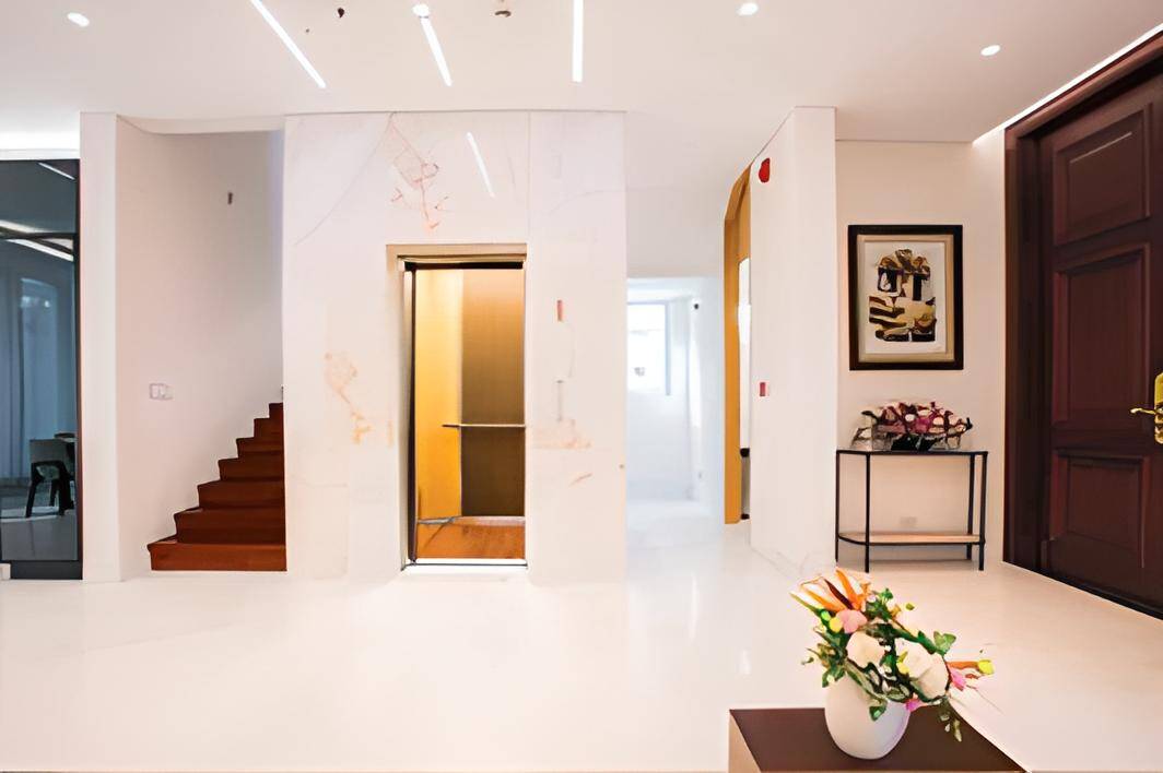Toàn bộ mặt ngoài thang máy được ốp đá cẩm thạch trắng với quy cách ốp lát âm dương. Các mảng đá được xử lý bề mặt khác nhau trên cùng một nền.