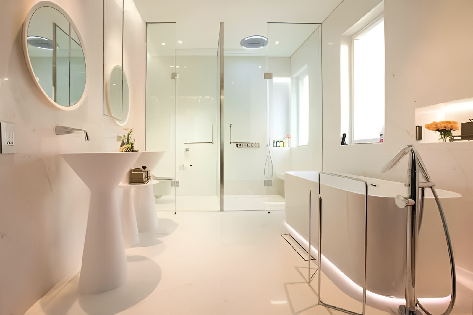 Tông màu sáng sang trọng được dùng cho mọi chi tiết trong phòng tắm, tạo sự sạch sẽ và gọn gàng.