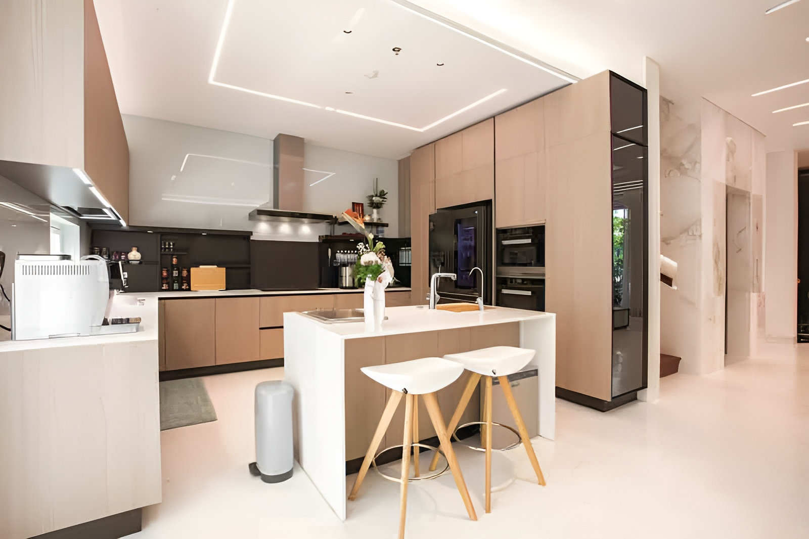 Hệ tủ bếp màu sáng thiết kế cao kịch trần với tay nắm âm giúp khu bếp trông sạch sẽ và gọn gàng.