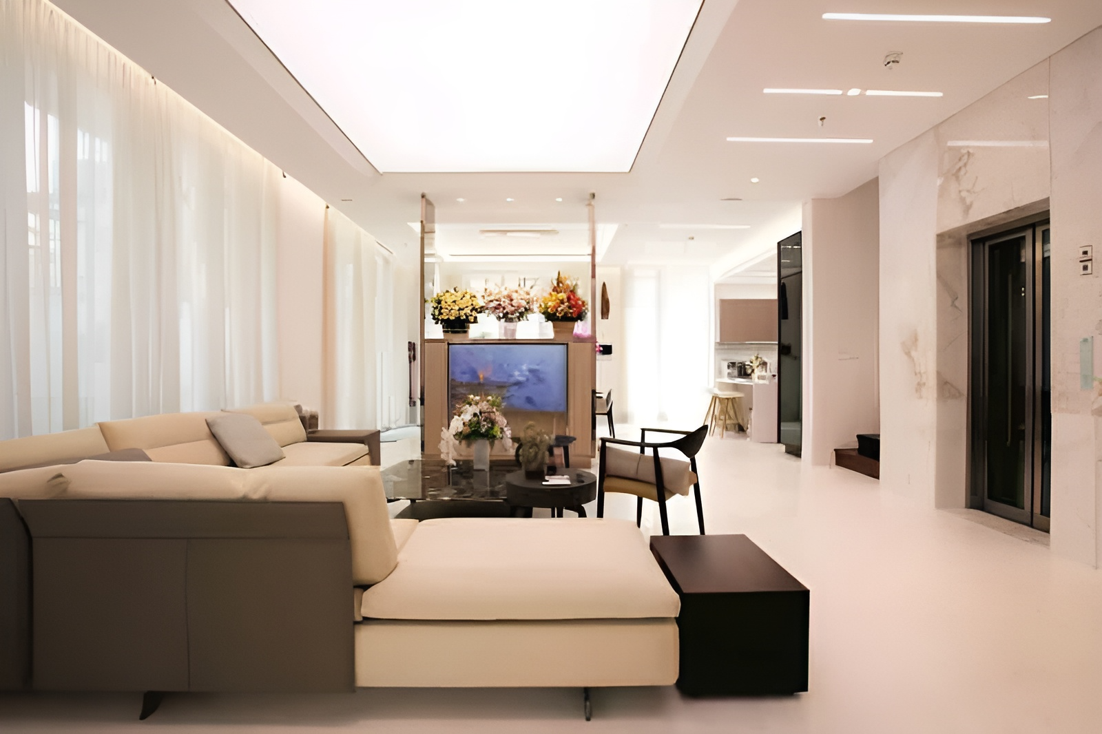Giữa phòng ăn và phòng khách được ngăn cách bởi tủ kệ tivi chạm trần với mặt inox bóng gương màu đồng, vừa tạo được sự riêng tư mà không bị quá bí bách với hệ đèn âm trần, bộ ghế sofa dài màu trắng kem.