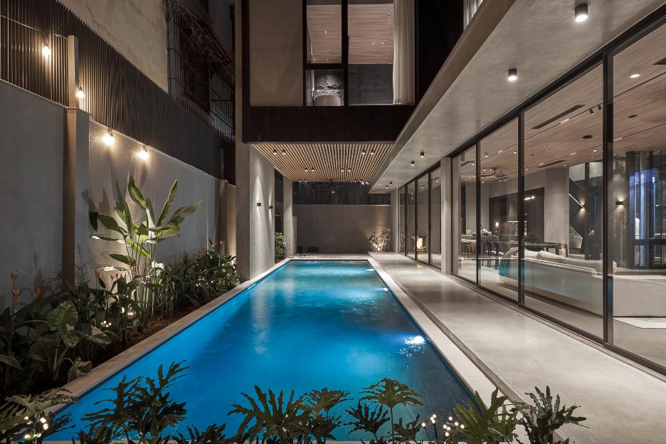 Thiết kế bể bơi chạy dọc hông nhà mang lại không gian thư giãn, đồng thời giúp luân chuyển không khí, tạo sự thông thoáng. Nhờ đó mà phòng khách, bếp và khu sinh hoạt chung đều nhận được ánh sáng, gió tự nhiên.