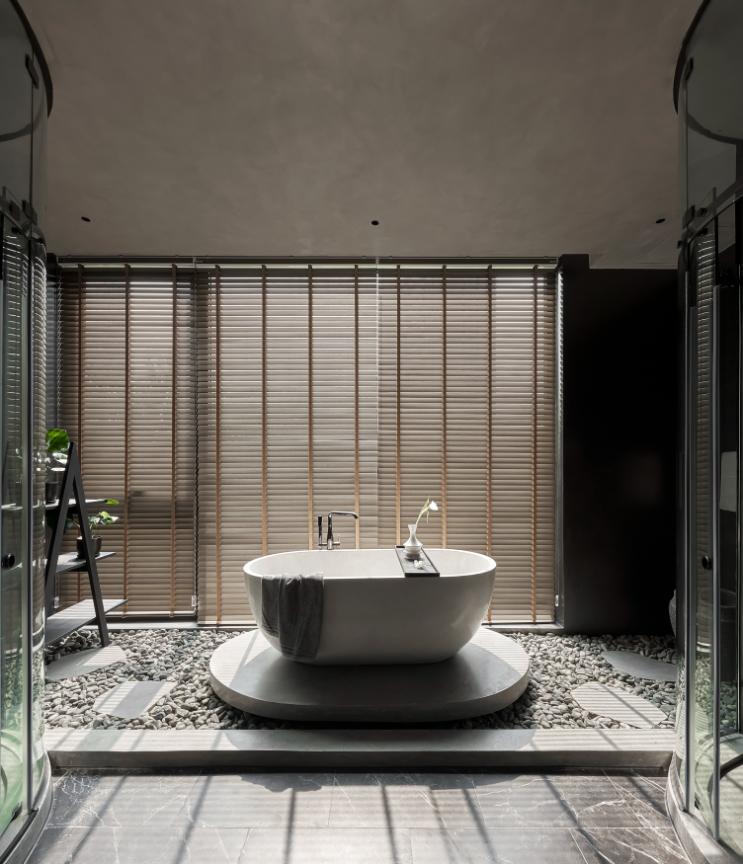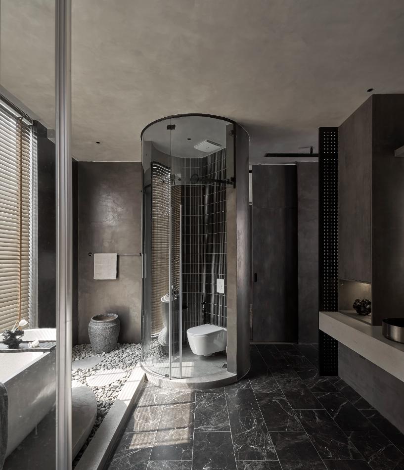 Với mong muốn tái hiện không gian nghỉ dưỡng tại gia, các khu vực tắm nằm, tắm đứng được bố trí với tông đen, xám cá tính.